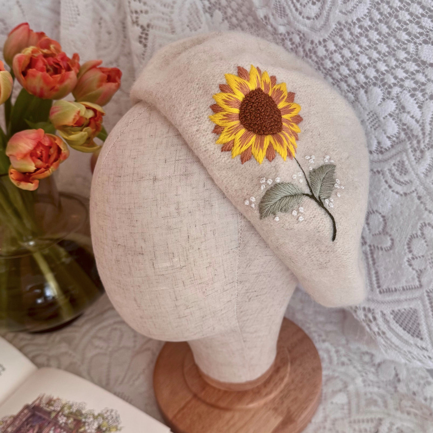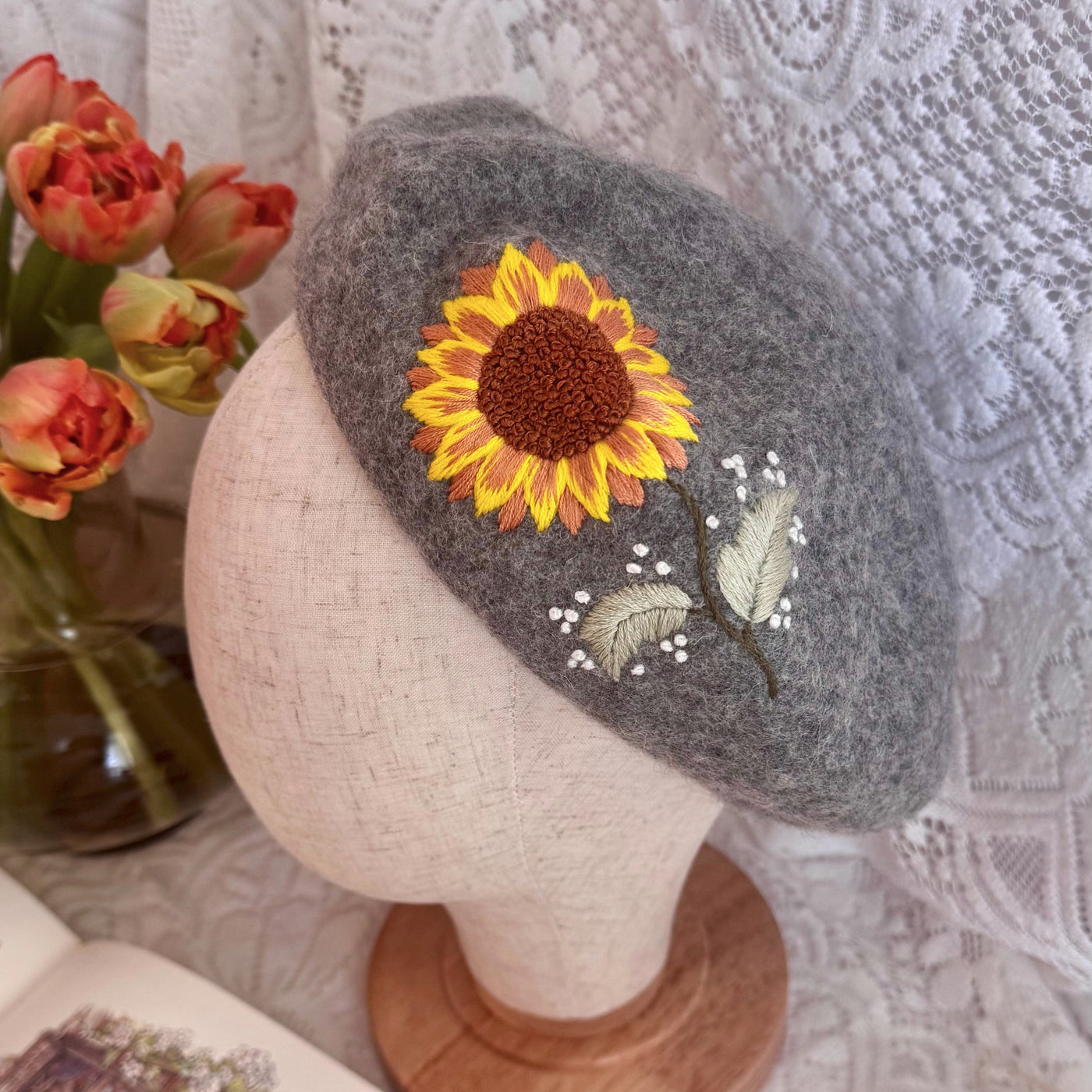 Käsintehty kukkakirjailtu villabaretti on ainutlaatuinen asuste, valmistettu pehmeästä huovutetusta villasta, joka lämmittää hyvin ja tuntuu miellyttävältä päässä. Herkkä käsin kirjailtu kukkakuvio on toteutettu laadukkailla kirjontalangoilla, ja jokainen baretti viimeistellään huolellisesti, mikä tekee siitä yksilöllisen.