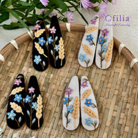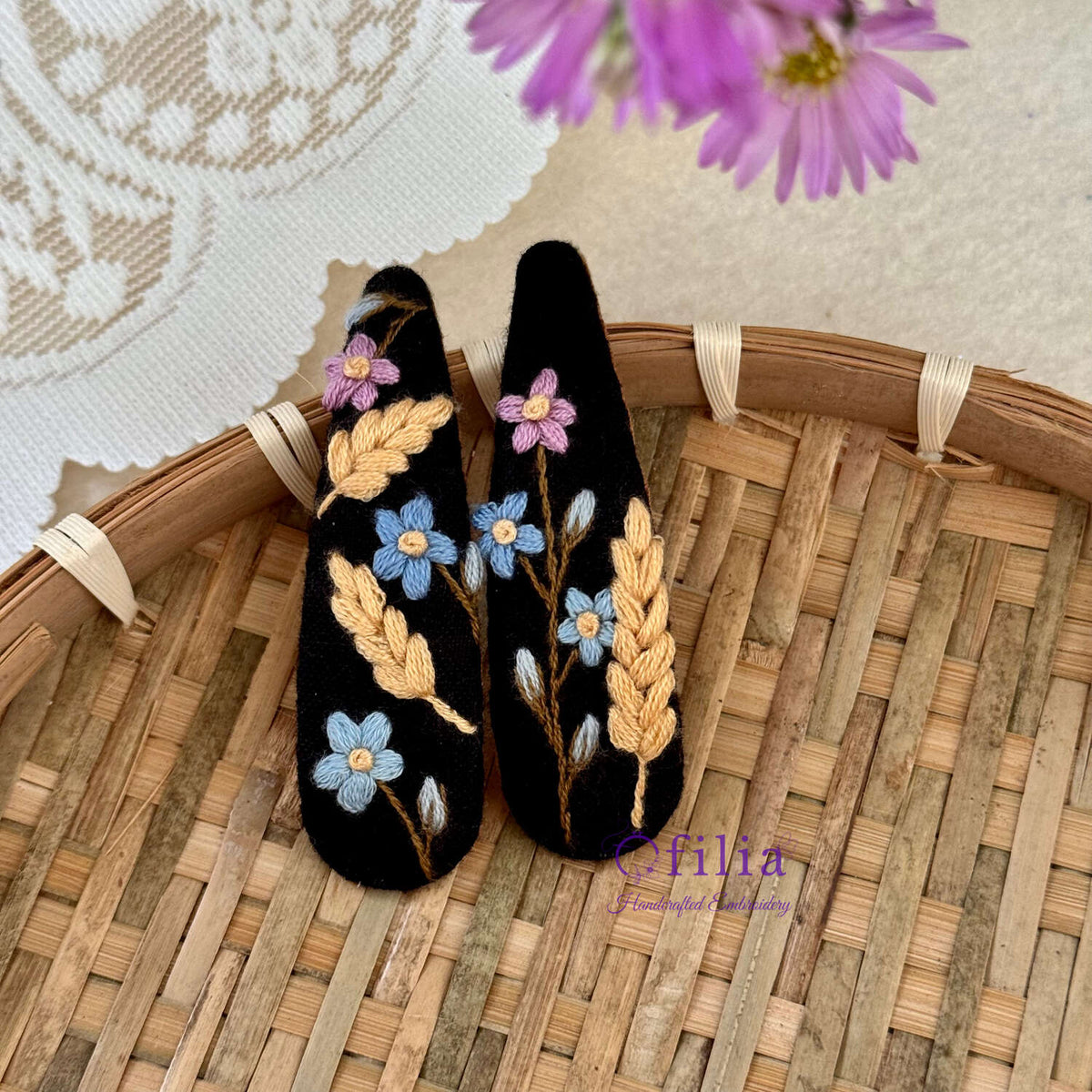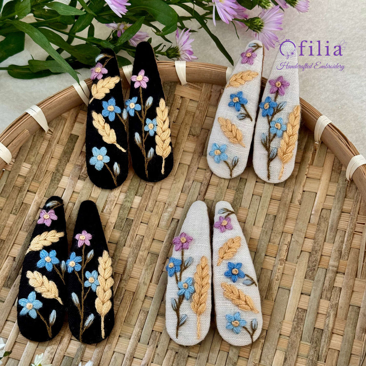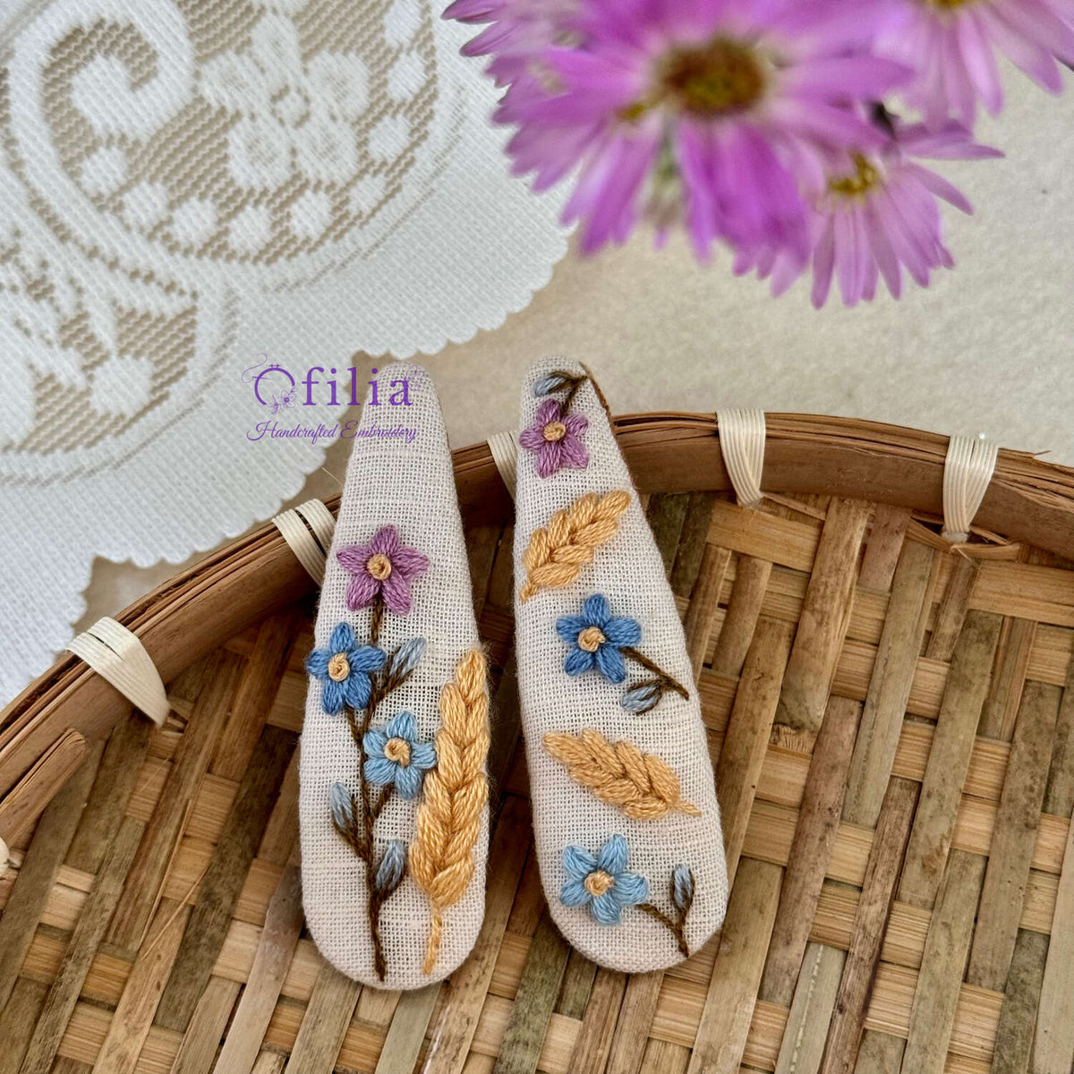 Nämä kauniit, käsintehdyt hiuspinnit on valmistettu rakkaudella ja huolella, ja niissä on yksityiskohtaista kirjontaa pehmeällä puuvillapellavakankaalla.