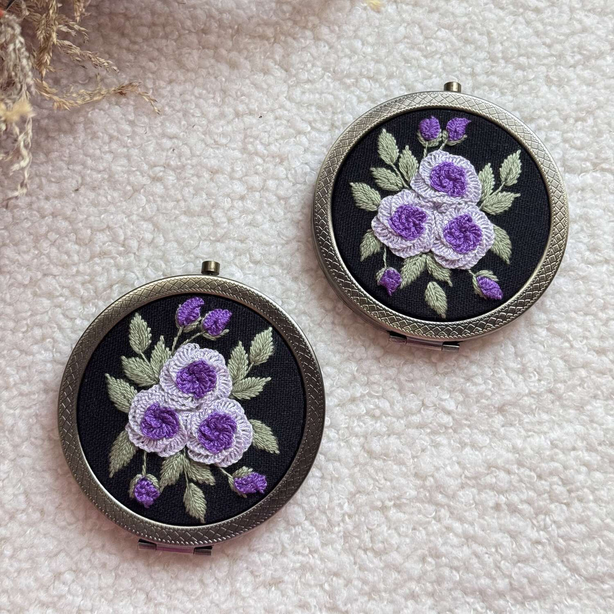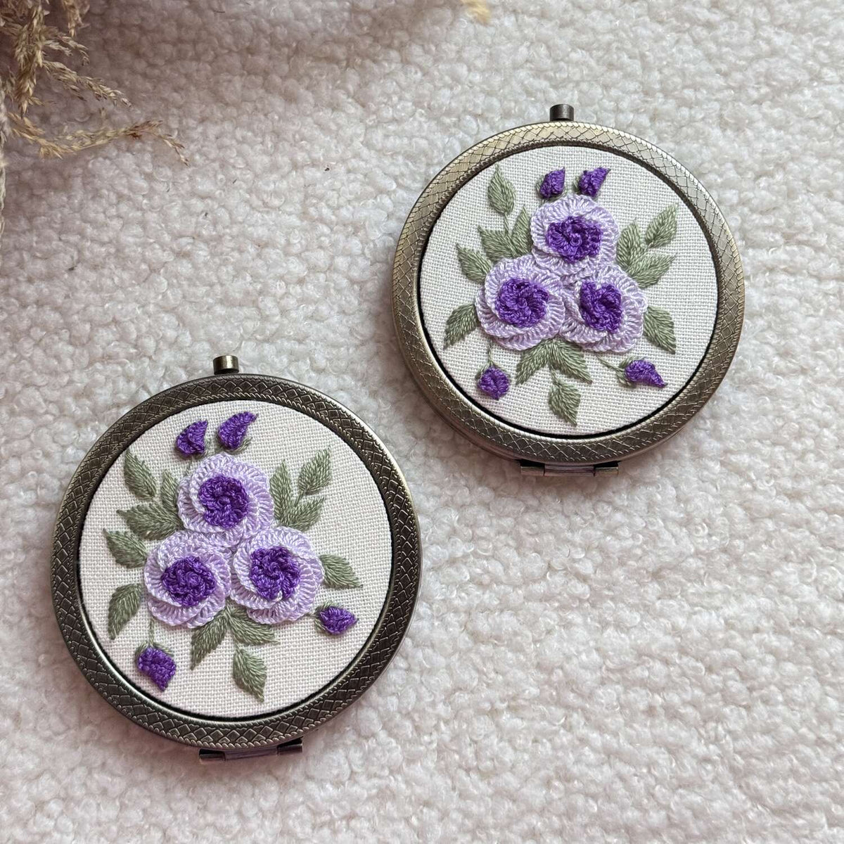 Tämä kompakti peili on päällystetty käsinkirjotulla kankaalla, jossa on suloisia kukka-aiheisia kuvioita – jokainen kappale on pieni taideteos.