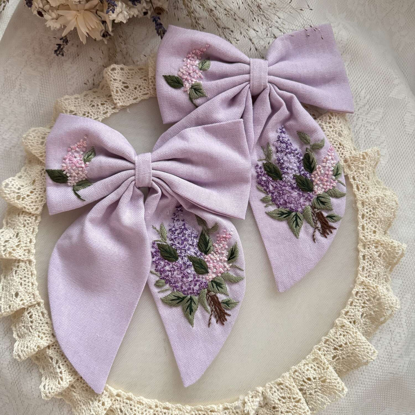 These beautifully handcrafted hair bows are made with love and meticulous attention to detail. Soft organic linen is delicately embroidered to create designs full of charm and character. Each bow is a little piece of art, perfect for adding a personal touch to your look.