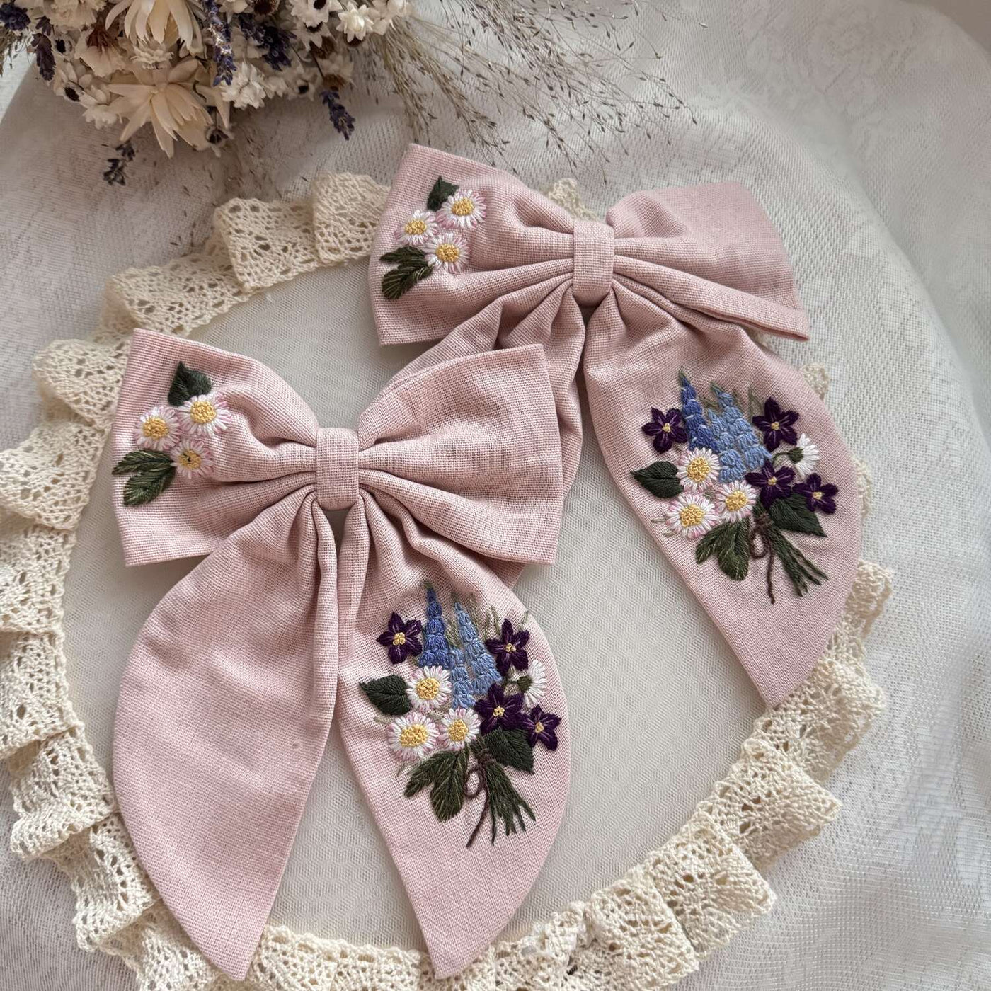 These beautifully handcrafted hair bows are made with love and meticulous attention to detail. Soft organic linen is delicately embroidered to create designs full of charm and character. Each bow is a little piece of art, perfect for adding a personal touch to your look.