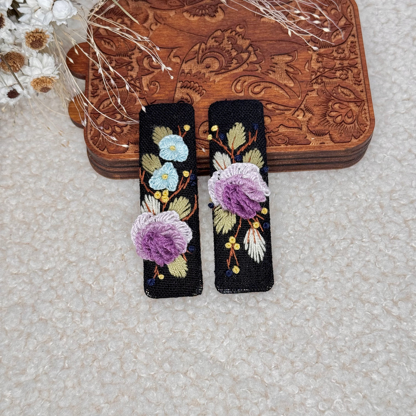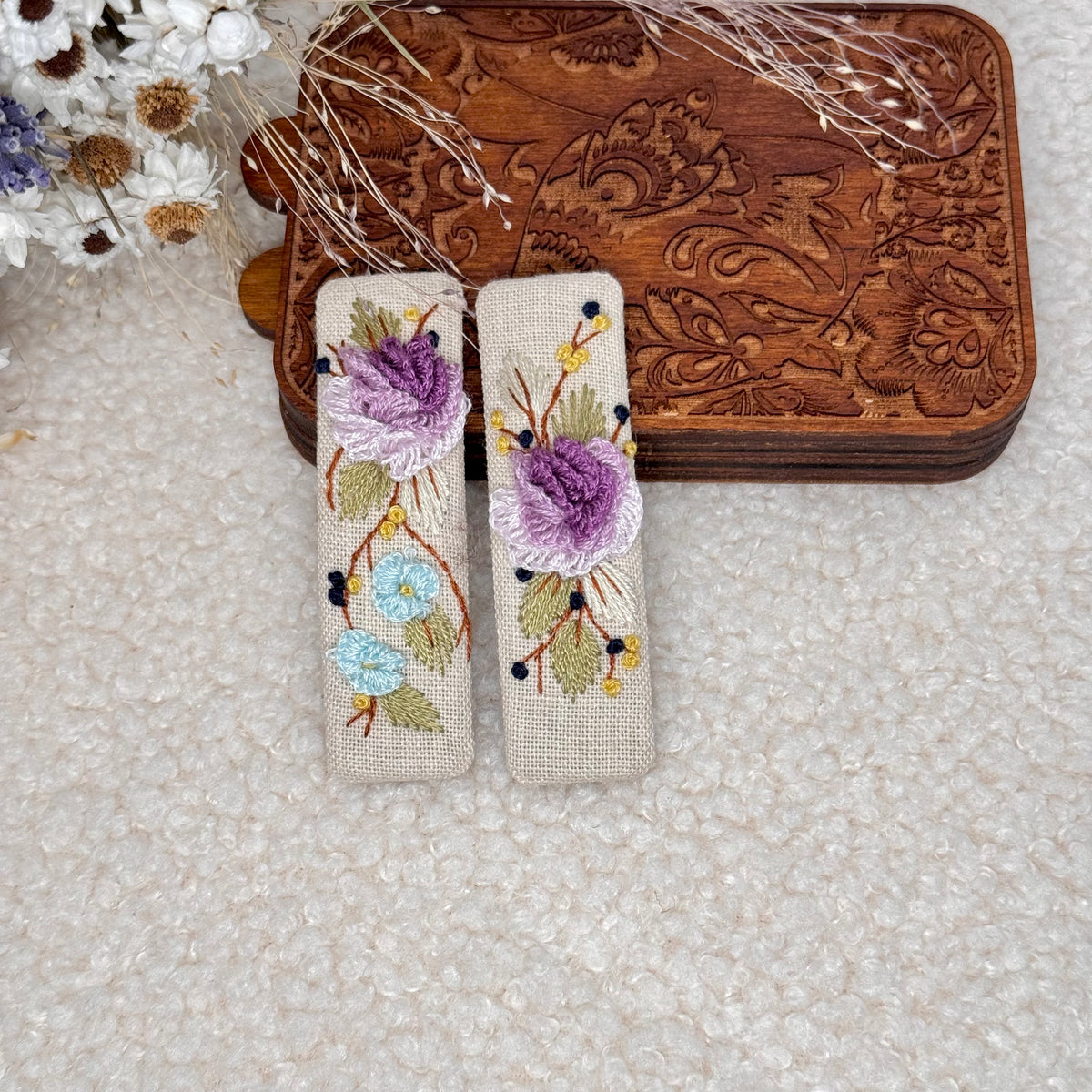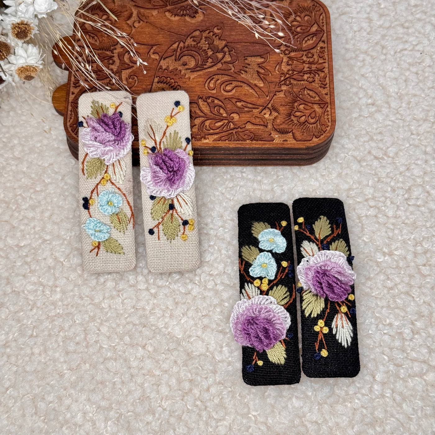 Nämä kauniit, käsintehdyt hiuspinnit on valmistettu rakkaudella ja huolella, ja niissä on yksityiskohtaista kirjontaa pehmeällä puuvillapellavakankaalla.