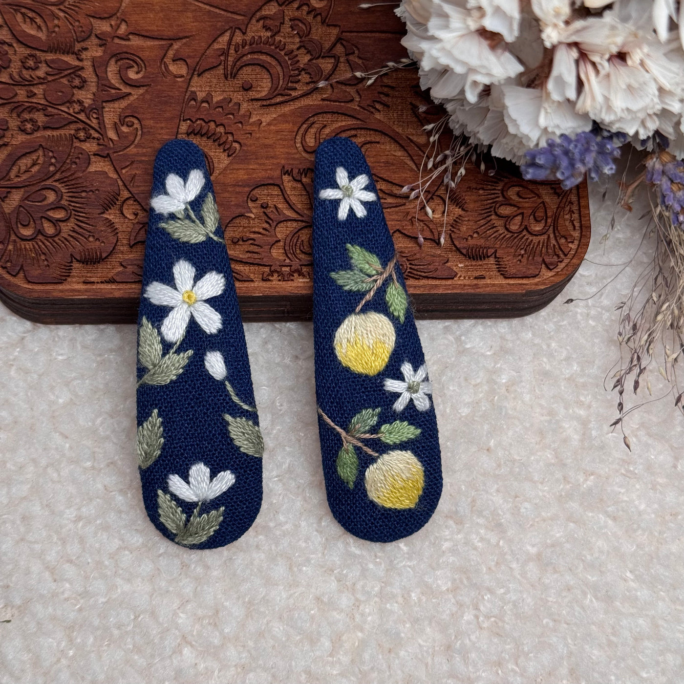 Nämä kauniit, käsintehdyt hiuspinnit on valmistettu rakkaudella ja huolella, ja niissä on yksityiskohtaista kirjontaa pehmeällä puuvillapellavakankaalla.
